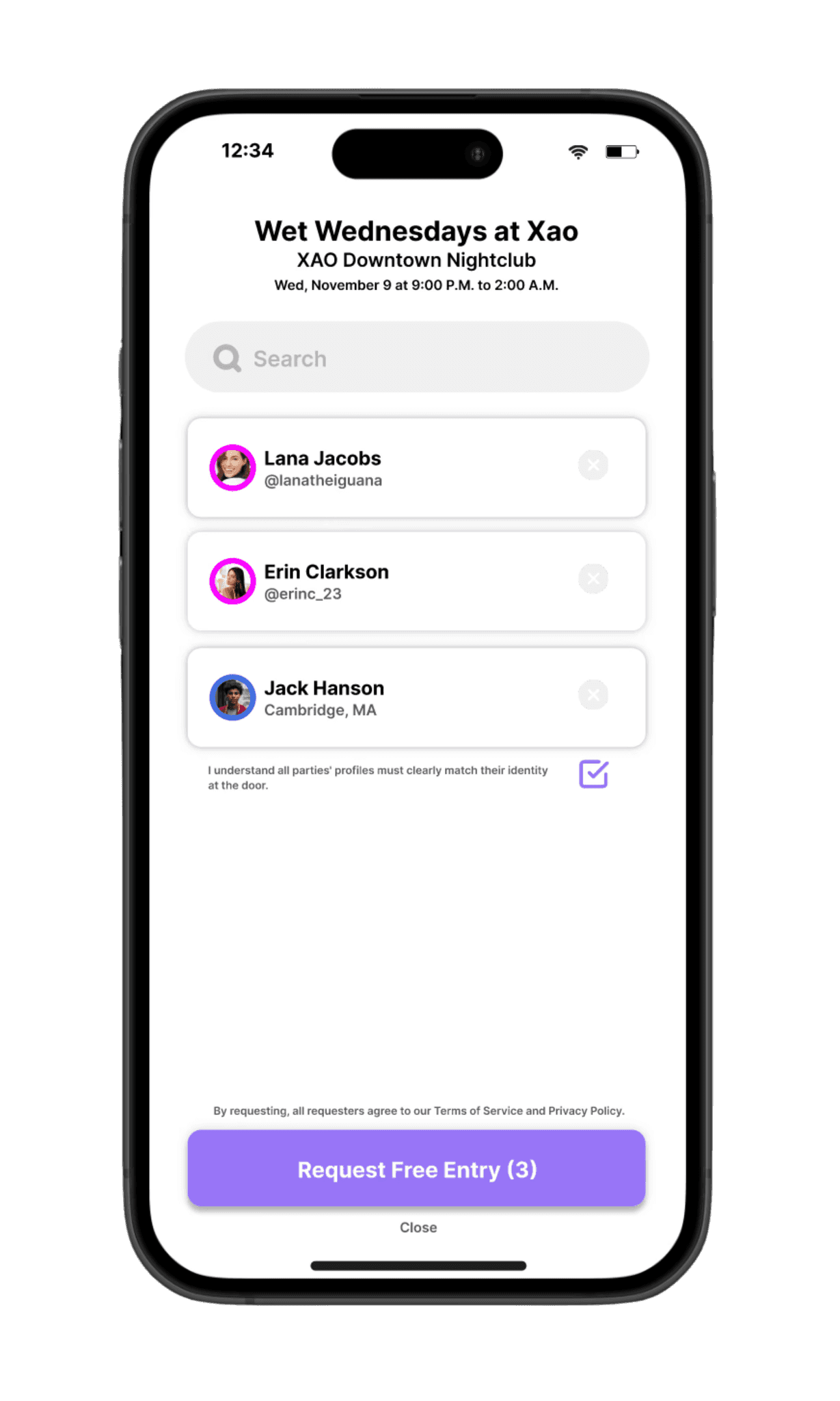See guest list + age/gender, when enabled by hosts. Look out for a bolt if the crowd is surging⚡.